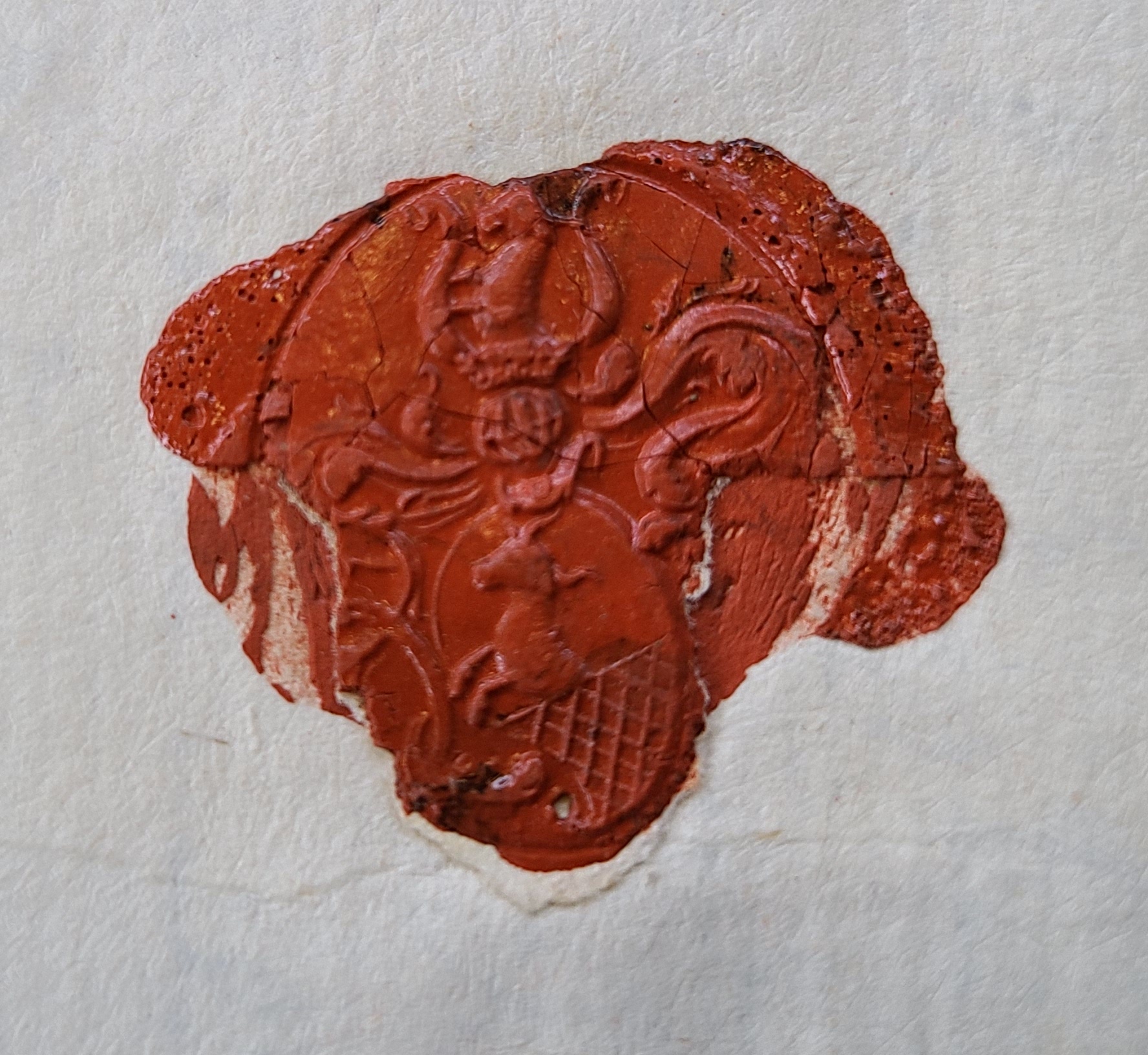 Siegel des Bergwerksinspektors Johann Christoph Moyses von Khyrrberg aus der Hauptrechnung der Grube St. Wolfgang in Alpirsbach von Trinitatis 1710 bis Crucis 1711 (Deckblatt s.u.).[1] Das Wappensiegel ist schwer zu erkennen (und noch schwerer zu fotografieren). Der Schild zeigt eine aus einem Berg (Dreiberg?) wachsende Figur (Löwe? vgl. nächsten Absatz und Siegel von Johann Heinrich Moyses von Khyrrberg weiter unten), in den ausgestreckten Händen jeweils eine Hirschstange haltend (Bezug zum württembergischen Wappen?). Der Schild wird von Helmdecken begleitet. Der Helm ist ein Bügelhelm. Das Helmkleinod ist eine Perlenkrone, darauf ein von einer Schlage umwundenes Kreuz zwischen einem offenen Flug. Links neben dem Flug die Buchstaben "I. C. M.", rechts "V. K.", die Initialen des Bergwerksinspektors. Der Siegelrand wird von einer Art Seilmuster gebildet. Das Wappensiegel ist eine leicht abgewandelte Form (Helm und Hirschstangen) des Wappens, das Johann Thomas und Martin Moses von Khyrrberg, die Söhne des Bürgermeisters zu Elnbogen in Böhmen, am 18. Mai 1609 von Kaiser Rudolph II. verliehen bekommen haben. Dieses zeigt im Schild in Schwarz ein vorwärtsgekehrter goldener Löwe, aus silbernem Dreiberg wachsend. Das Kleinod ist ein braunes Kreuz, von einer silbernen Schlange umwunden, zwischen einem offenen Flug. Die Decken sind Schwarz und Gold. Was der Löwe in den Händen hält, ist nicht genannt, ebenso wenig die Krone auf dem Helm.[2] Der Löwe ist wahrscheinlich dem Wappen von Elbogen (= Elnbogen), heute Loket in Tschechien, entnommen.[3]