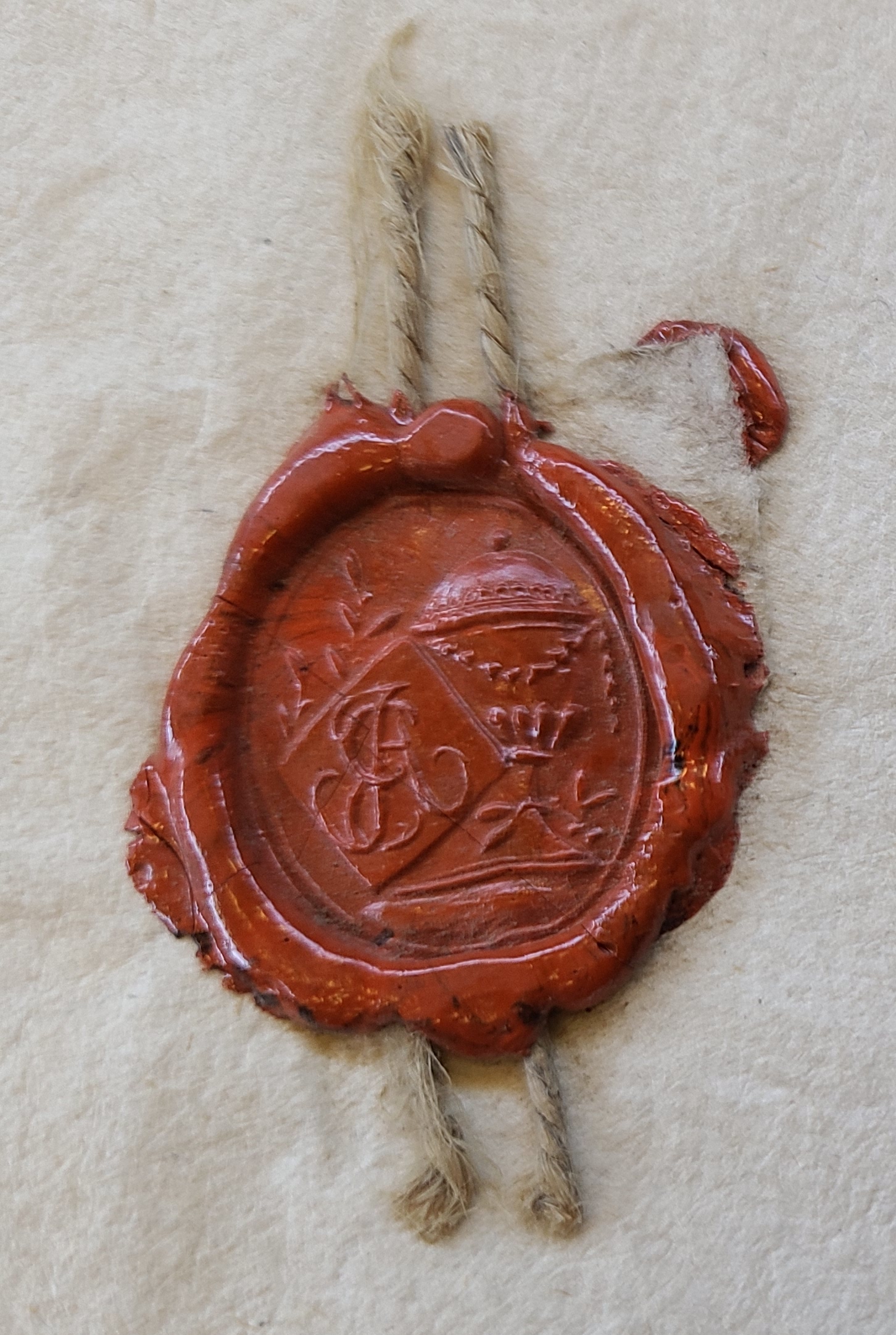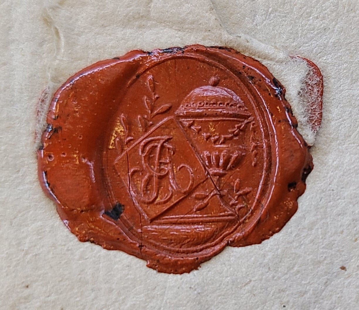 Siegel des Schichtmeisters Johann Anton Eyth, Christophstal (Freudenstadt), 1796 und 1797, aus Beilagen zu den Bergrechnungen der Grube Sophia: ein Pokal oder eine Vase auf der rechten Seite, davor mittig-links ein Karo, den Pokal etwas verdeckend, im Karo die Großbuchstaben J A E übereineindergelegt, restliche Fläche mit kleinen Ranken belegt