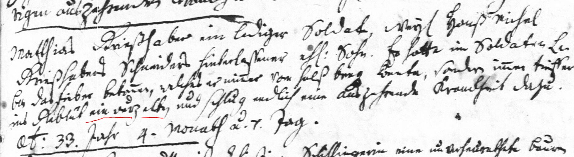| verstorbene Person | Matthias Grießhaber, Soldat, 33 J 4 M 7 T alt, geboren 10.02.1737 (errechnet), ledig, "Er hatte im Soldaten Leben das Fieber bekommen, welches er nimmer vom Halß bringen konnte, sondern immer tieffer ins Geblüt [... ... ...] und schlug endlich eine auszuehrende Kranckheit dazu" |