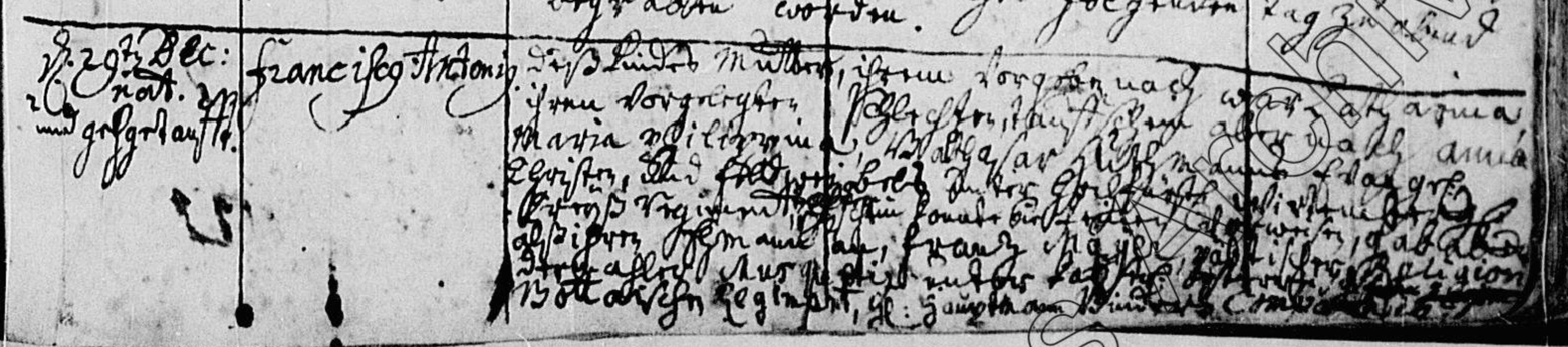 Eintragzitat"Dieß Kindes Muter, ihrem Vorgeben nach war Catharina, ihren vorgelegten schlechten Tauffschein aber nach Anna Maria Philippina, Balthasar Huthmanns evangel. Christen, und Feldweibels unter hochfürstl. wirtemberg. Creyß Regiment, Tochter, [einen Ehe]schein konnte sie keinen vorweisen, gab aber alß ihren Ehmann an, Franz Mayer, päbstischer Religion, dermahlen Musquetir unter kayserl. [...] Bottaischen Regiment, Herrn Hauptmann Binders Compagnie"
