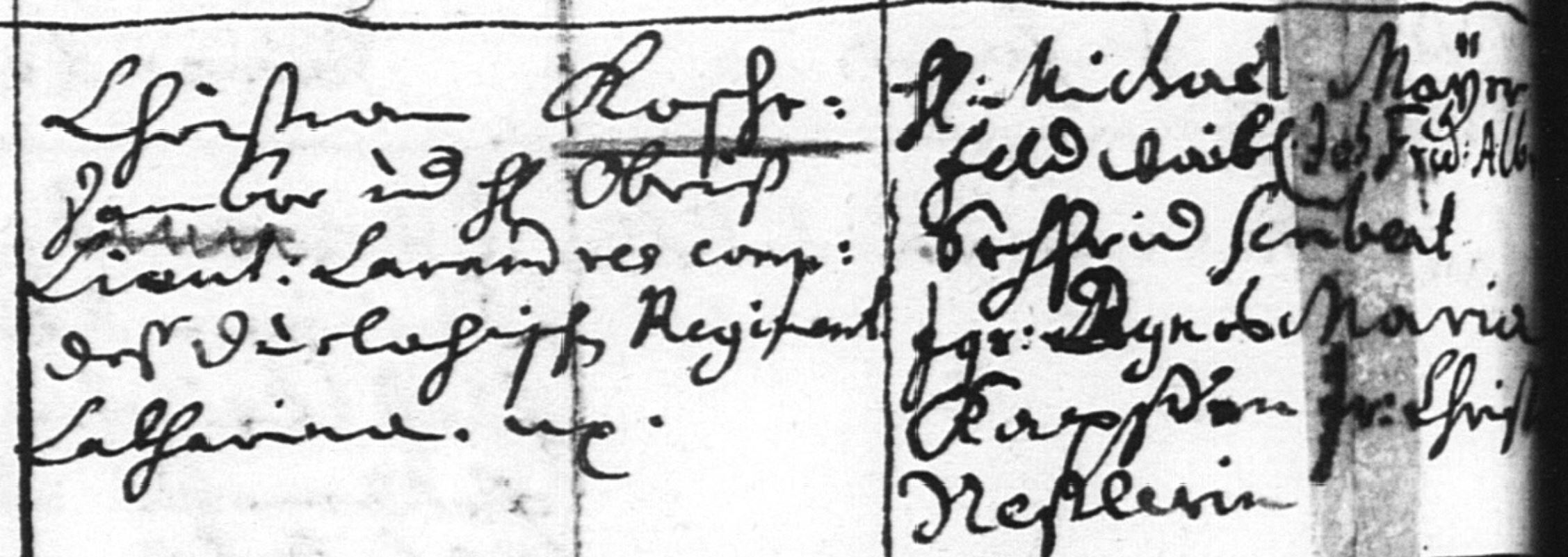 | Vater | Christian Kosche, Tambour (Trommler), Kompanie unter Obristlieutenant Lareindre, durlachisches Regiment, Name des Obristlieutenants schwer zu lesen |