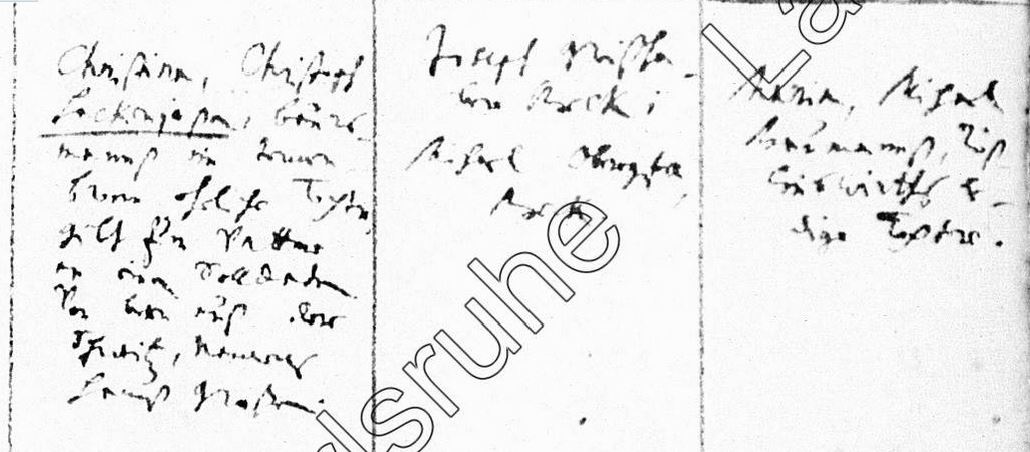 | Eintragzitat | "Dieß Kindes Muter, ihrem Vorgeben nach war Catharina, ihren vorgelegten schlechten Tauffschein aber nach Anna Maria Philippina, Balthasar Huthmanns evangel. Christen, und Feldweibels unter hochfürstl. wirtemberg. Creyß Regiment, Tochter, [einen Ehe]schein konnte sie keinen vorweisen, gab aber alß ihren Ehmann an, Franz Mayer, päbstischer Religion, dermahlen Musquetir unter kayserl. [...] Bottaischen Regiment, Herrn Hauptmann Binders Compagnie" |